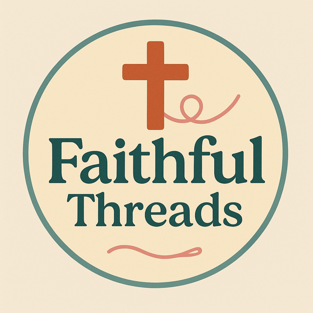 Logo for Faithful Threads with a brown cross and a pink thread loop, encircled by a thin teal circle, with the words "Faithful Threads" in teal inside the circle.